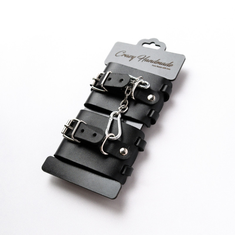 Черные оковы из натуральной кожи с металлическими деталями - это незаменимый аттрибут в страстных играх. Оковы выполнены в виде двух изящных ремешков с кольцами и соединены цепочкой с карабинами. Это стильный аксессуар для БДСМ-игр.