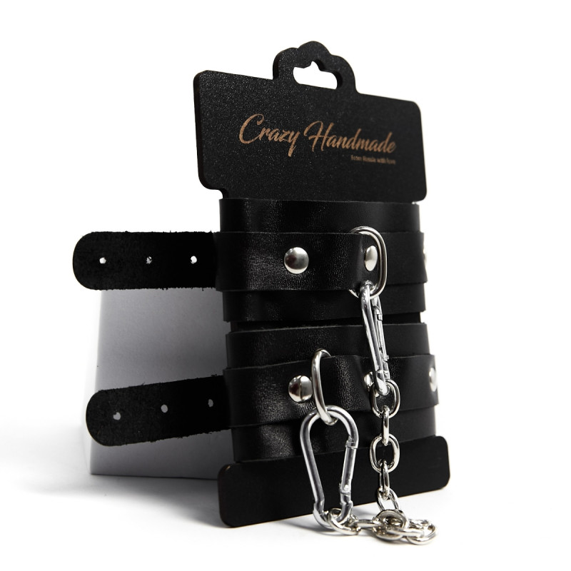 На оковах прочное хромированное овальное кольцо. В комплекте соединительная цепочка с двумя карабинами.